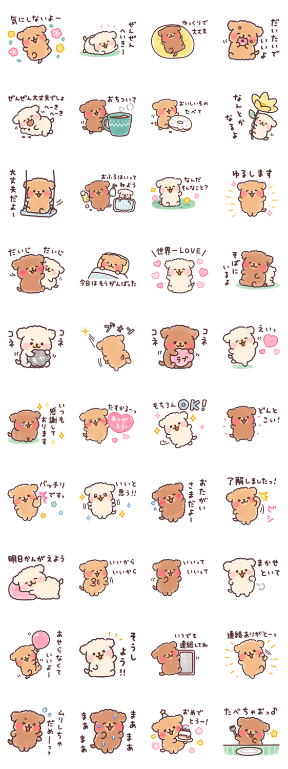 ふわふわもこもこトイプードルのおだやかで優しいのんびりスタンプです。やさしい気づかいの言葉もたくさん!そんなにがんばらないでゆるくおおらかにいこうー!