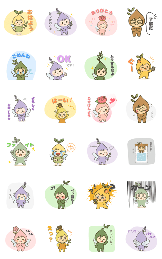 A set of 24 soothing phrases for everyday use, like "Good job," "Thank you," and "OK!" Gentle-faced droplets softly brighten your conversations.