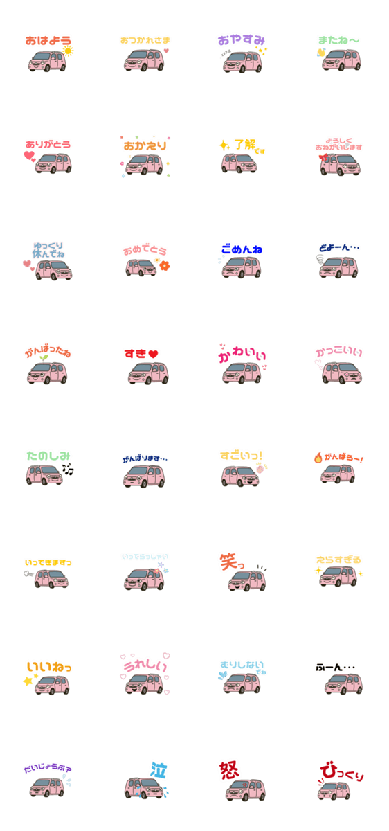 ピンク色のまるっこい車が、毎日の気持ちをやさしく伝えるよ。 「おはよう」「おつかれさま」など、日常会話にぴったり! ふんわり癒し系のスタンプです。
