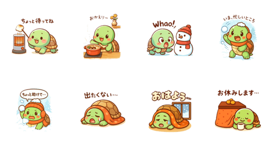 「意外と忙しい亀が、眠そうな目と静かな知恵、やさしいユーモアで冬を乗りこなす。ほっこり会話や詩的なひとときにぴったり。」