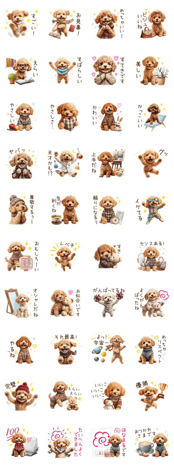 褒めて褒めて褒めまくる!子犬トイプードルがやさしく褒めて、労って、全力で肯定してくれるスタンプです♪
