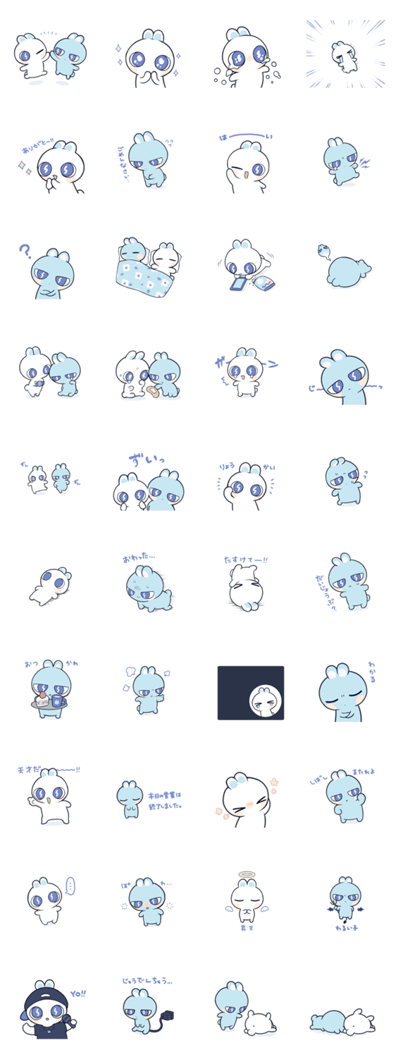 まんまるおめめのお調子者うさぎ「ぽみ」と、ジト目でクールなうさぎ「らむね」のスタンプです。 何気ない日常も、2匹でいるとたのしいね!