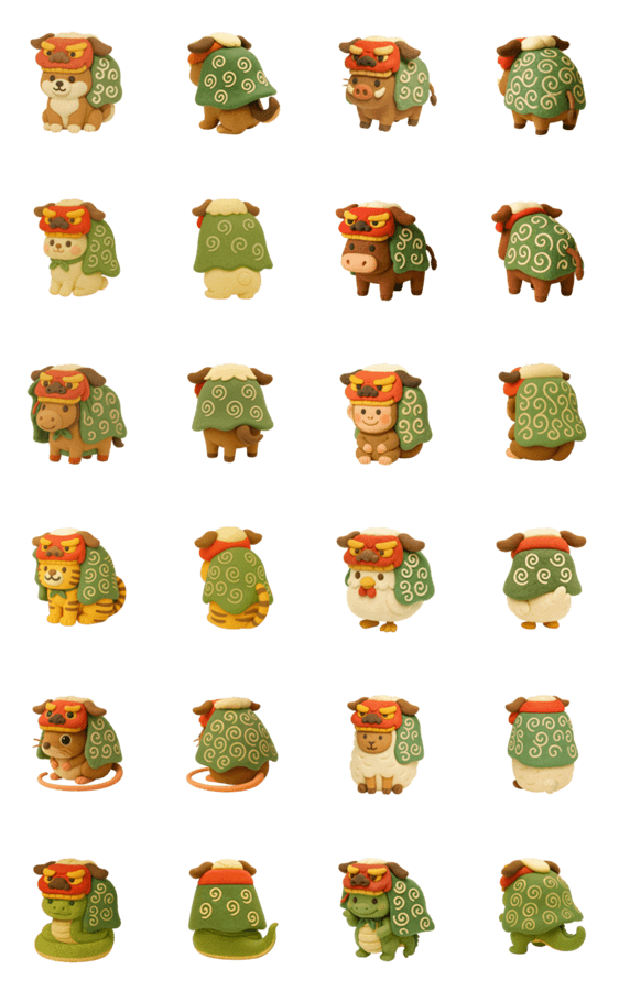 新年を祝う干支たちが、紙粘土風のあたたかい質感で獅子舞に変身! それぞれの動物がユニークな表情で踊る、かわいくて縁起のいい1月のスタンプです。