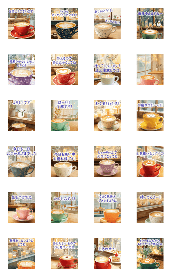 冬に癒されるあったかカフェの日常セットです。カフェが大好きな方にピッタリです♪♪お疲れ様/おはよう/了解/ありがとう/カフェラテ/コーヒー/優しさ/猫/肉球/大人