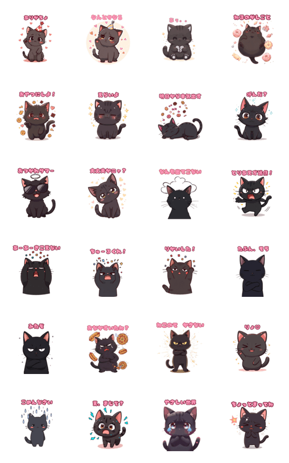 miyuhelthが贈る、眠い悪ガキ黒猫スタンプ!半目だけど憎めない、いたずら好きの黒猫がLINEを彩る。朝から「了解」、「ありがとう」
