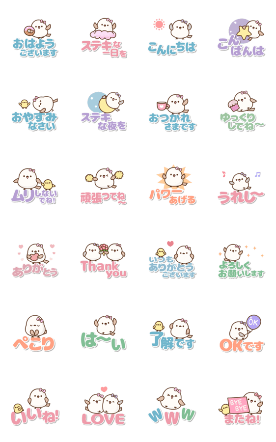 シマエナガのトリボンが飛びながら気持ちを届ける [でか文字] のアニメーションスタンプです♪ 毎日よく使うメッセージを集めました♫