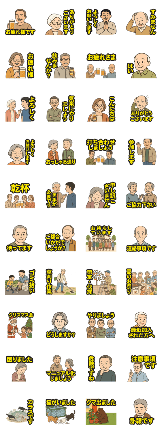 自治会、町内会、敬老会、ご近所仲間、井戸端会議、シルバークラブ、おじさん、おばさん、おじいちゃん、おばあちゃん高齢者でもご近所で使いやすい自治体向けスタンプです