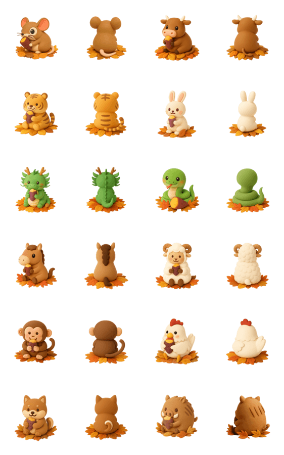 紙粘土の干支たちが落ち葉の中で焼き芋を楽しむ、ほっこり秋のスタンプです。 秋のあいさつや、のんびりしたやりとりにぴったり