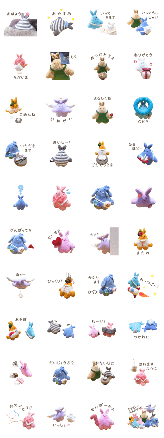 毛糸でできた謎の生き物、うさてぃーたちのスタンプです。第1弾は、挨拶や感情表現など、日常会話で使いやすいセットです♪