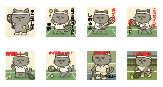 ムスッとしたグレーの猫がテニス用語を使っています。テニス好きの方使ってみてください。