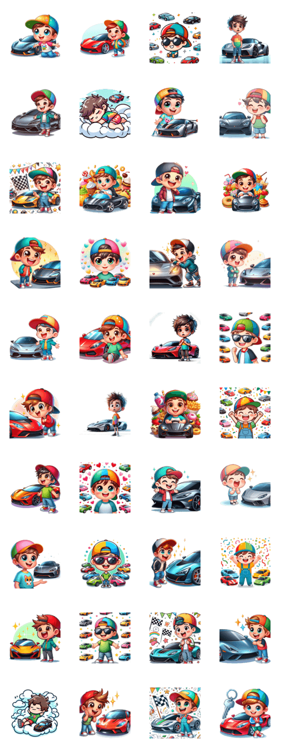スピードとスタイルを愛する人にぴったり!クールなスポーツカー少年のスタンプで、会話をもっと楽しく盛り上げよう。