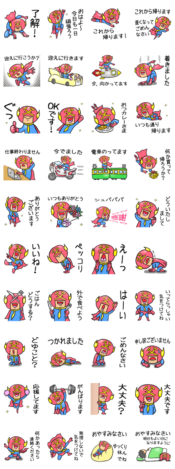 スーパーヒーローおとんマン!!頑張るお父さん達のための使いやすいスタンプです。家族の平和を守るため戦えおとんマン!!行けおとんマン!!(パパ、父、親父)