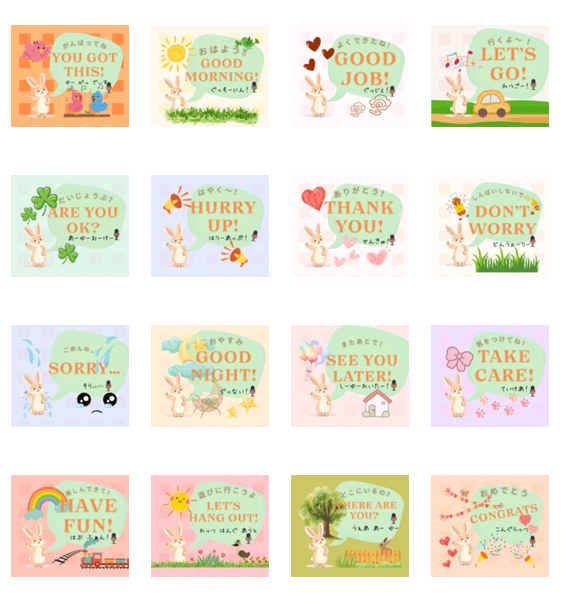 うさぎさんと一緒に、日常英語フレーズをかわいく届けるスタンプです。 発音読みもあるので、英語レッスンしながら、家族や友だちと気軽なコミュニケーションにどうぞ!