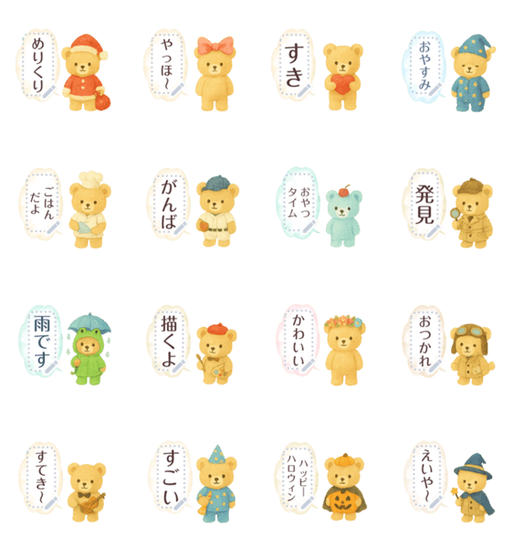 吹き出しに大きめ文字で自由に入力できる♪水彩風のラブリーなくまちゃんがいっぱい☆クリスマスのサンタやハロウィン・探偵・カエルのレインコート・絵描きさん・野球など 現在この商品は一部のスマートフォン版LINE 10.3.0以上のトークルームでのみ使用できます。動作環境の最新情報はヘルプをご確認ください。