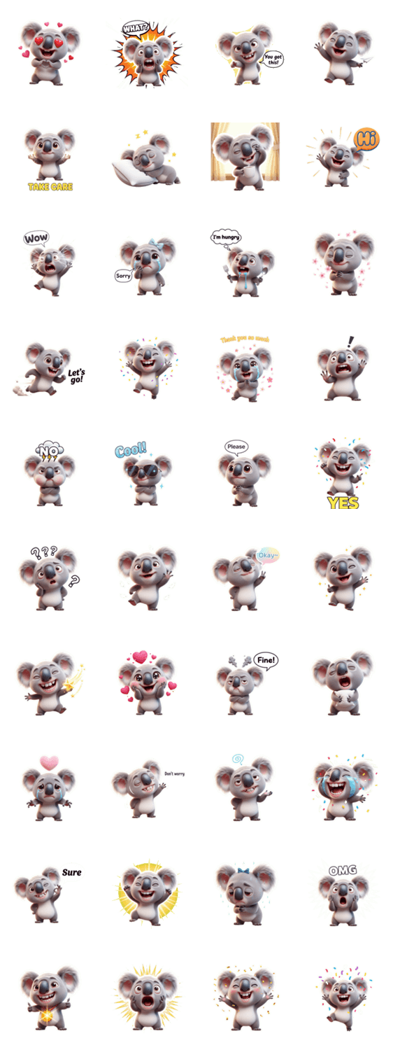 コアラのスタンプ、かわいくていやし系、あいさつやなまけポーズ、やさしくてリラックスした雰囲気