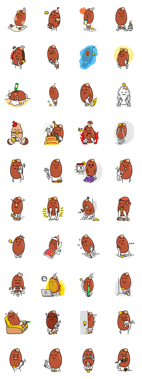 は焼き卵をモチーフとして生まれたキャラクターです。 卵の殻が割れて、卵の頭がぷっくり~と出るのが特徴です。悠々自適した顔のブレグは、いつものんびりしています
