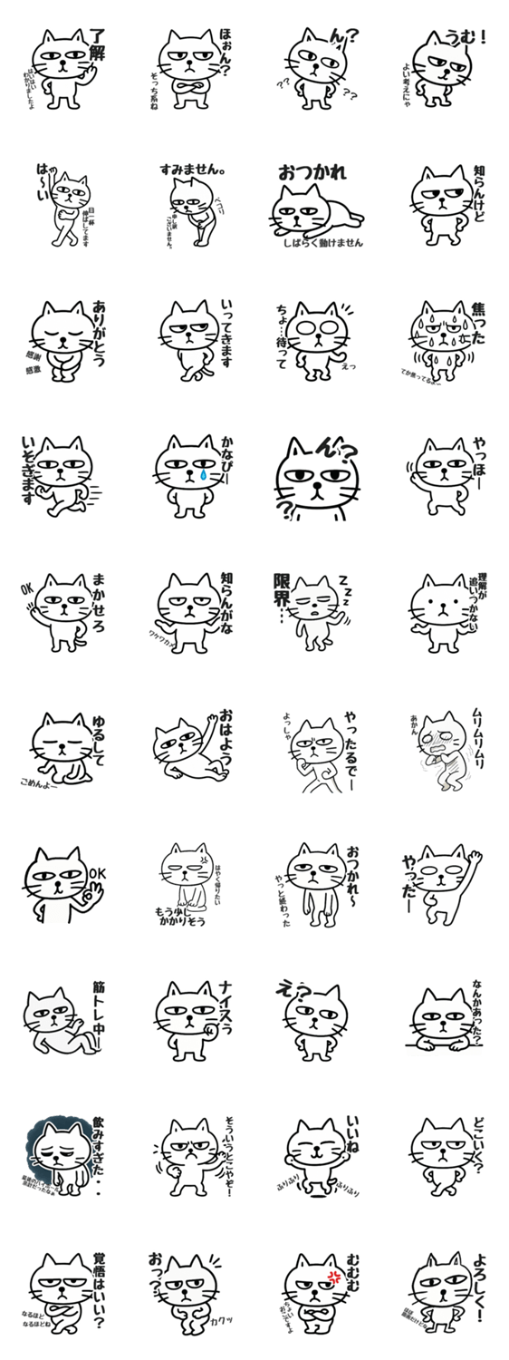 無表情なのに動きだけ全力なゆるネコスタンプ。喜ぶ怒る焦る落ち込む白目OKぺこりふて寝など日常で使いやすい表情&リアクションをたっぷり収録。ねこ好きな人にもぜひとも