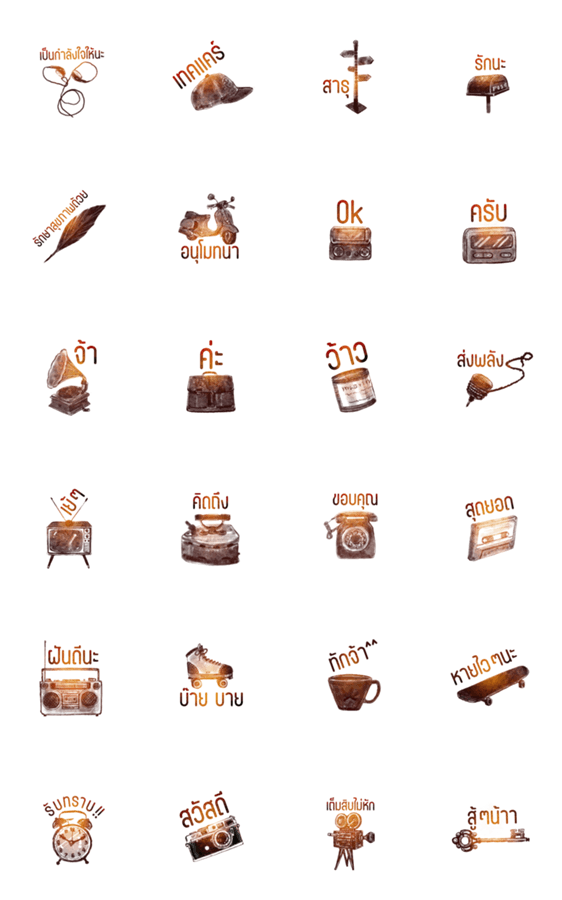 Vintage style stickers from the 70s-80s, brown tones, charming antiques, simple and retro letters.