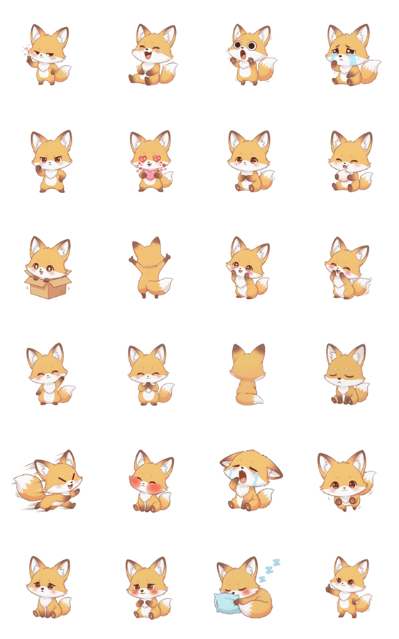 もふもふでちょっと生意気なオレンジ色のキツネのスタンプコレクション! 楽しい挨拶から、いたずらっぽいキメ顔まで、あなたのチャットを生き生きと楽しく彩ります。