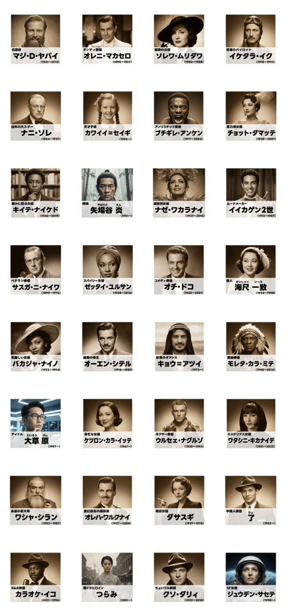 日常で使いやすい架空役者のスタンプ。【男優/女優/有名人/偉人/歴史/会話/挨拶/連絡/返事/返信/友達/恋人/家族/夫婦/ネタ/ギャグ/面白い/笑える/爆笑/ダジャレ/煽る】