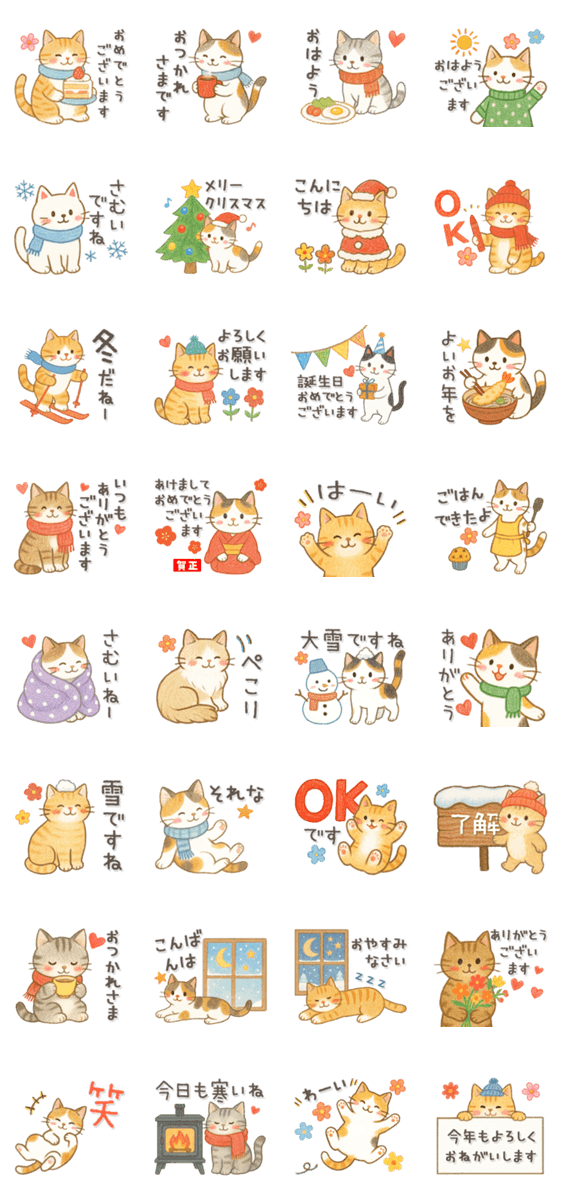 猫好きな方必見!毎日使えるかわいい猫のスタンプです☆挨拶や敬語など日常会話に♪冬(お正月や年末年始)におすすめ♪三毛・キジ白・はちわれ・茶トラ☆色鉛筆タッチ♪