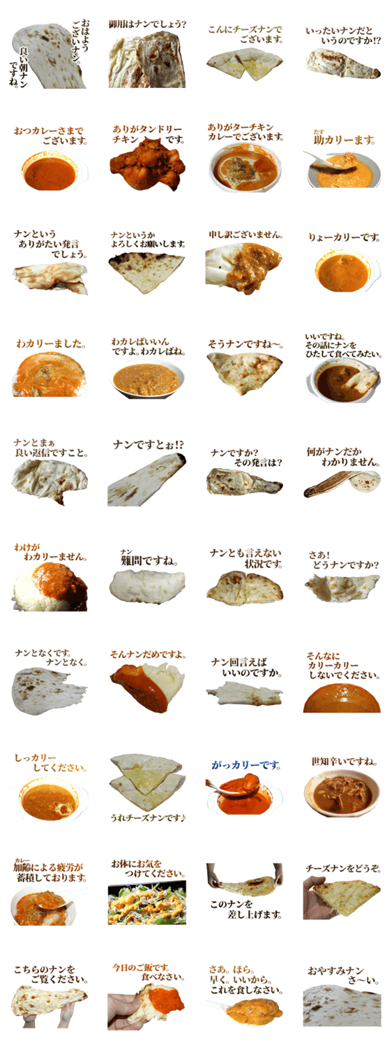 敬語を使うカレーとナンのスタンプです。敬語ナンで使いやすいですね。ダジャレ、丁寧語、チーズナン、タンドリー、インドネパール料理、カリー、職場、上司。実写食べ物。