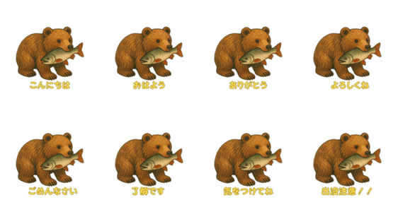 かわいい木彫りのクマのスタンプです。シンプルで楽しい動物の表情が、日常のチャットやあいさつ、リアクションにぴったり。