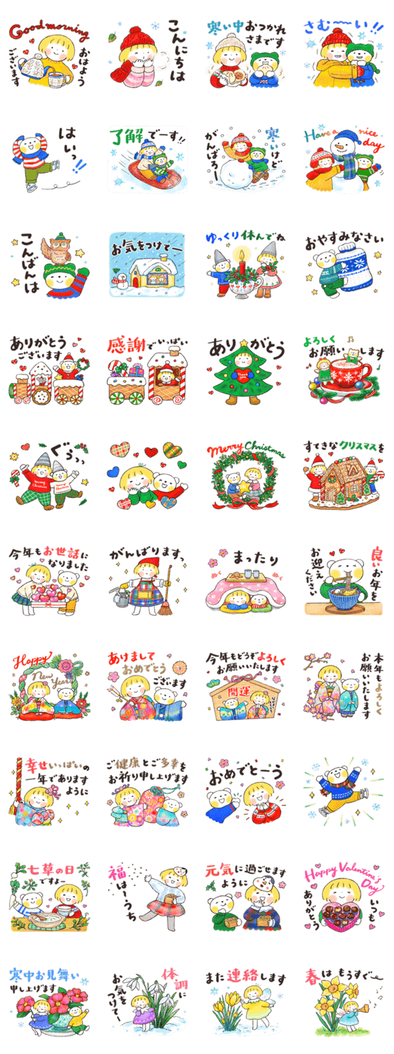 雪がきらきら舞う季節に、はるちゃんとふうくんがお届けする冬だより♪クリスマス、お正月、節分、バレンタインまで、楽しいイベントがぎゅっとつまったスタンプです♡