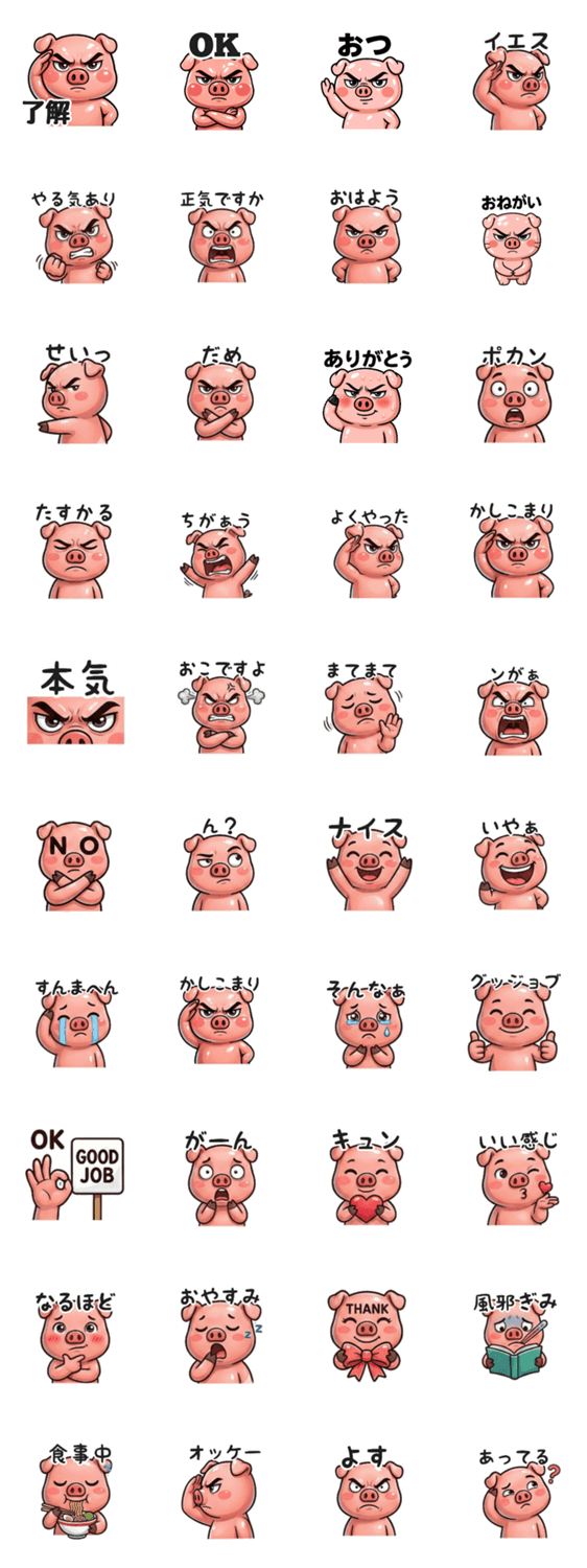ギラギラしたツヤの豚くんが、ちょっと強めで可愛いラインスタンプになりました。日常会話・返信・リアクションにぴったりです。“豚”“ぶた”スタンプ好きにもおすすめ