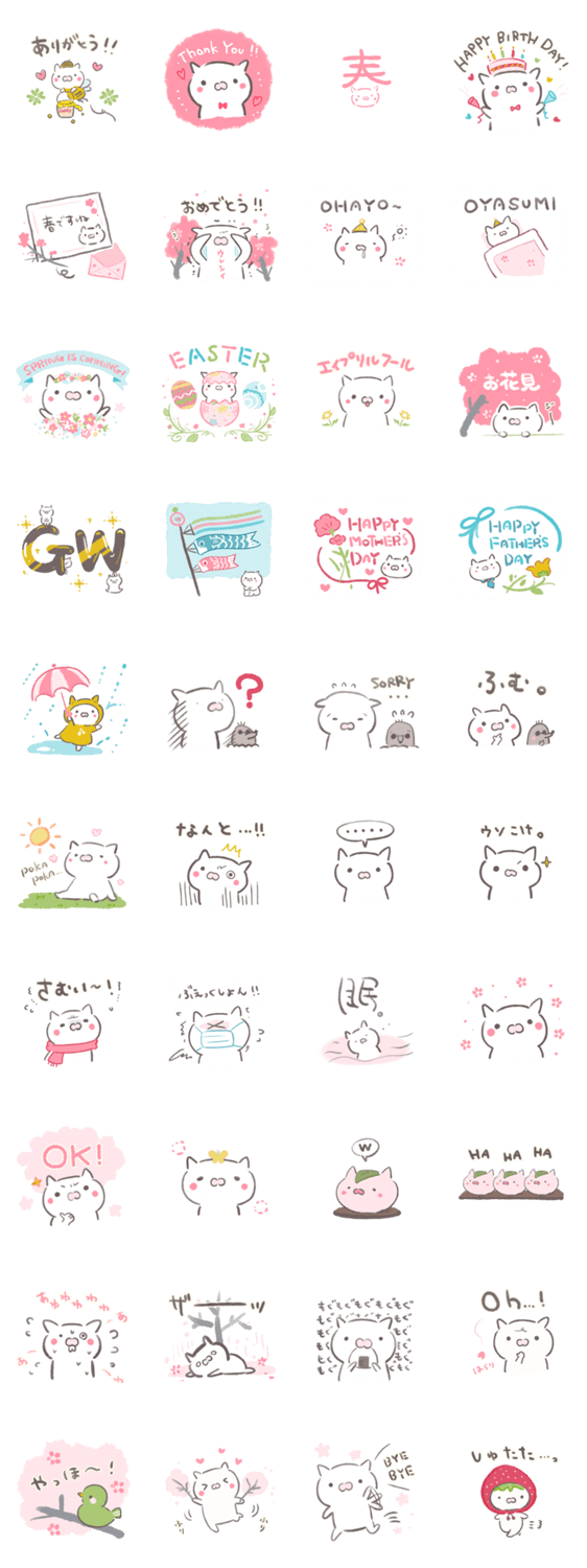 ゆるかわ白ネコの春セット。エイプリルフールやお花見、GW(ゴールデンウィーク)、イースターや父の日・母の日、こどもの日など春ネコにおまかせ。日常の挨拶も春仕様に。