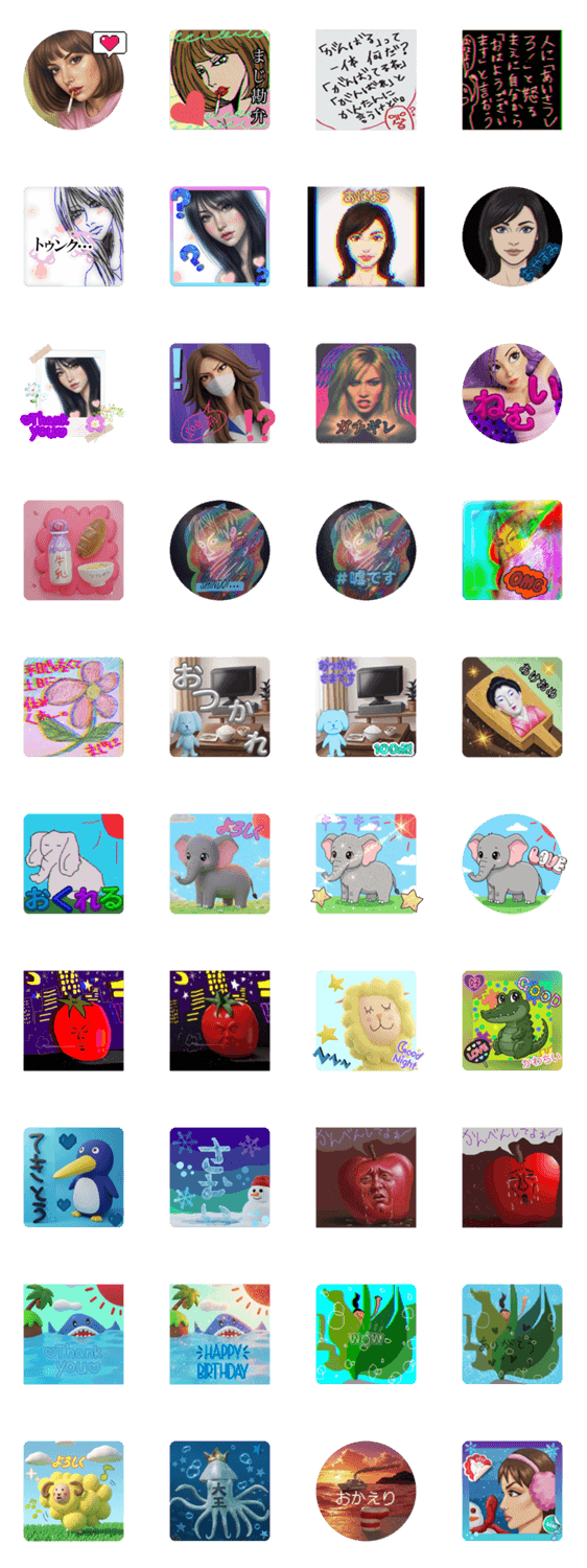 | スタンプ説明 | 昔描いてた絵の中で特に駄作なやつをAIとか加工を駆使して使いやすいスタンプとして蘇らせてみました #お絵描き黒歴史浄化作戦 #テイスト定まってない #元の絵もあるよ… |