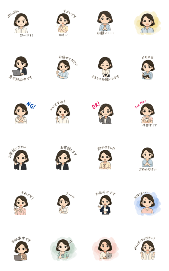 やわらかい敬語でまとめたお仕事スタンプです。 職場の同僚、上司や取引先との丁寧なやり取りに使えます。