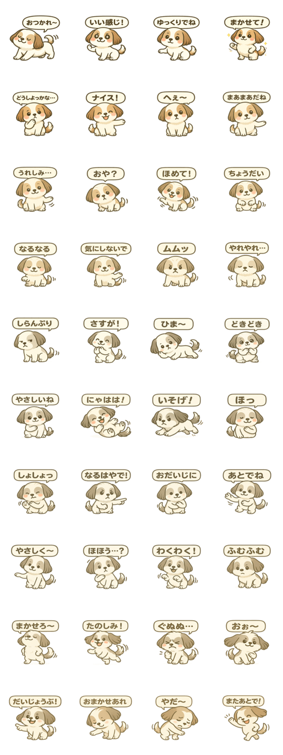 ふんわり可愛いシーズーの気持ちがいっぱい詰まったスタンプ。あいさつから気分の一言まで、毎日のやりとりをほっこり彩ります。