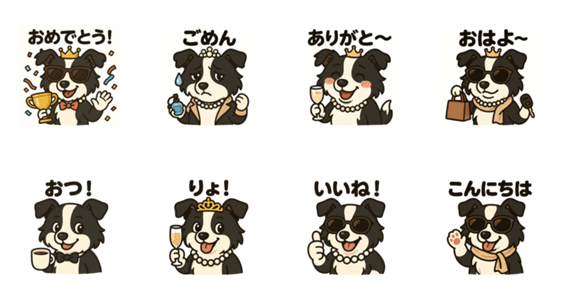 サングラス&パールでキメたセレブボーダーコリーのスタンプ。あいさつ、りょ、おつ、ありがとうからおめでとうまで、毎日のトークをゴージャスに彩ります。