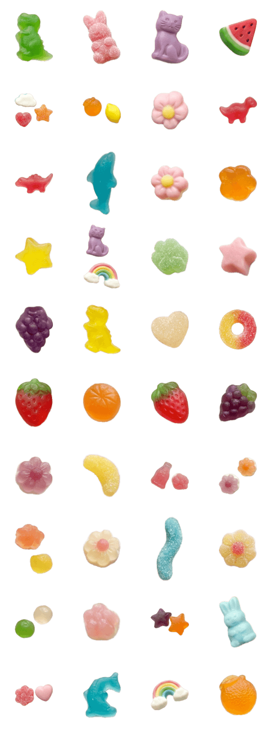 カラフル お菓子 スイーツ かわいい フルーツ味 ゼリー 甘い おいしい 癒し ぷにぷに 柔らかい 色とりどり 写真 リアル 人気 ナチュラル かわいい系 おやつ LINE トーク ※このスタンプはトークルームで大きく表示されるBIGスタンプです。