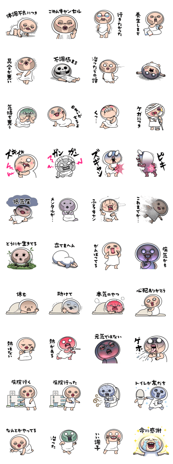 体調の悪さを訴えるスタンプで回復までを乗り切ろう。不調/風邪/しんどい/病院/痛い/心配/感謝/低気圧/メンタル/怪我/病気/頭痛/腹痛/腰痛/五十肩