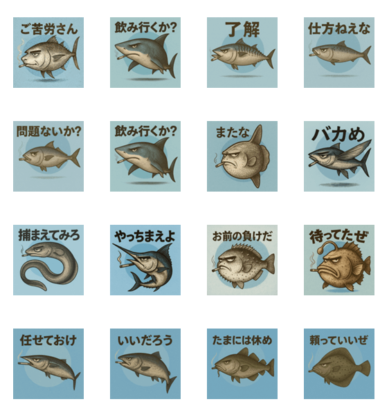 ハードボイルド風の魚類をスタンプにしました。 うまく使ってください。