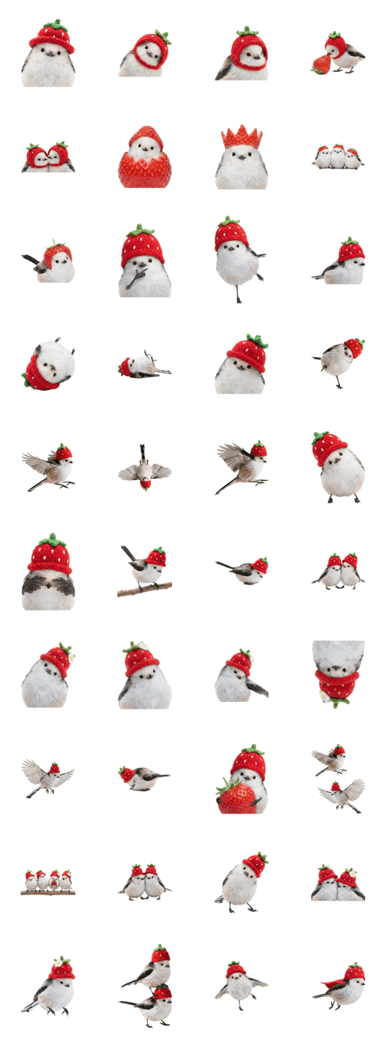 かわいい 白い小鳥 ふわふわ もふもふ いちご 赤 ピンク スイート 癒し 写真 リアル 人気 北海道 野鳥 デザート風 ナチュラル キュート LINE トーク emoji かわいい系 ※このスタンプはトークルームで大きく表示されるBIGスタンプです。