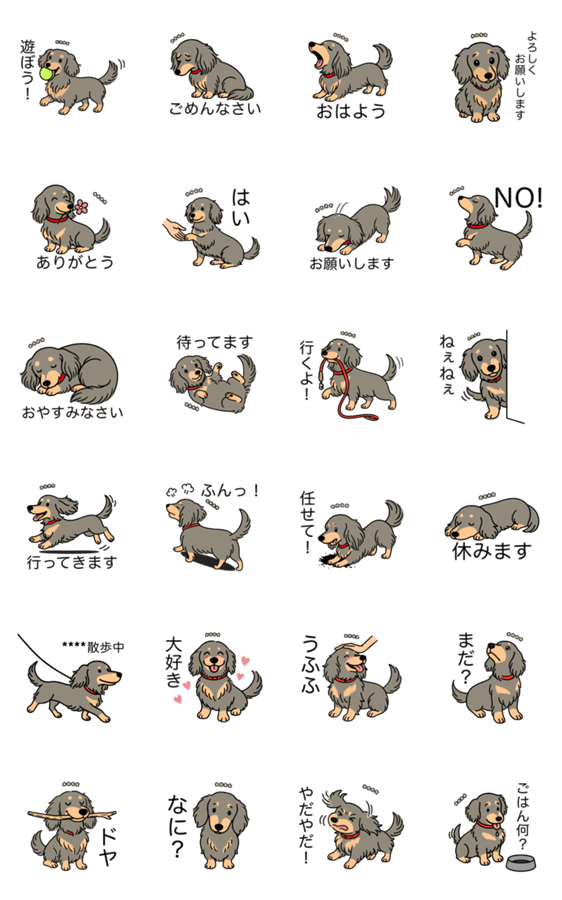 | スタンプ説明 | 愛犬の名前が入れられる!ミニチュアダックスロングコートイザベラタンバージョン |