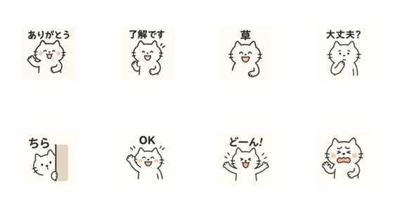 スケッチ風でゆるくておバカな猫スタンプのセット。シンプルな線と変な表情で会話を楽しくします。