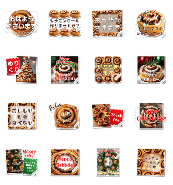 文章を書き込めるメッセージスタンプ♪ぐるぐる美味しいシナモンロール♡クリスマスツリーやリースもあります♪ 北欧/フィーカ/お菓子/おやつ/パン/グリーティングカード 現在この商品は一部のスマートフォン版LINE 10.3.0以上のトークルームでのみ使用できます。動作環境の最新情報はヘルプをご確認ください。