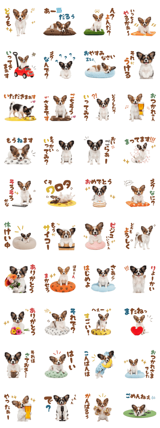 ふわふわの耳がチャームポイント!元気いっぱいのパピヨンが、あなたの気持ちを明るく届けます♡ あいさつ・リアクションまで、毎日使える万能スタンプ。