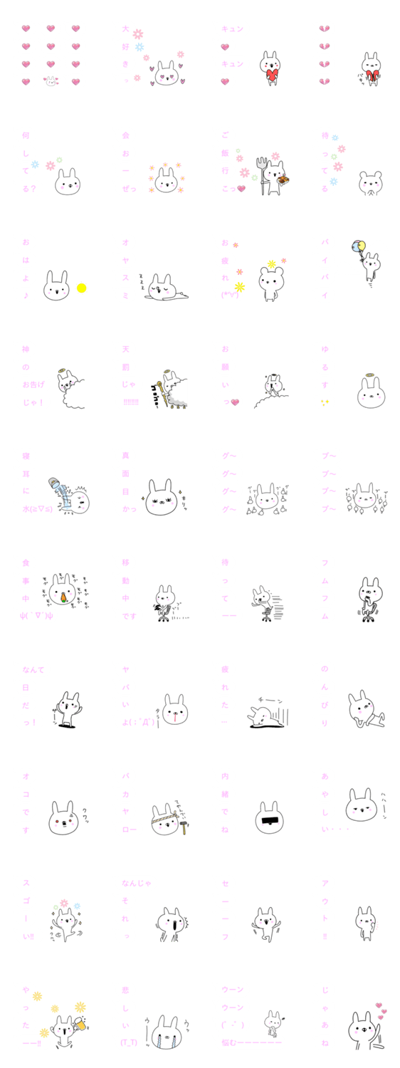 若い人なら誰もがやってる、一文字ずつ文字を送るふきだしを、スタンプにまとめました。ピンク文字で女子力アップなのでかわいく送れます。ウサギとクマが小さめに登場。
