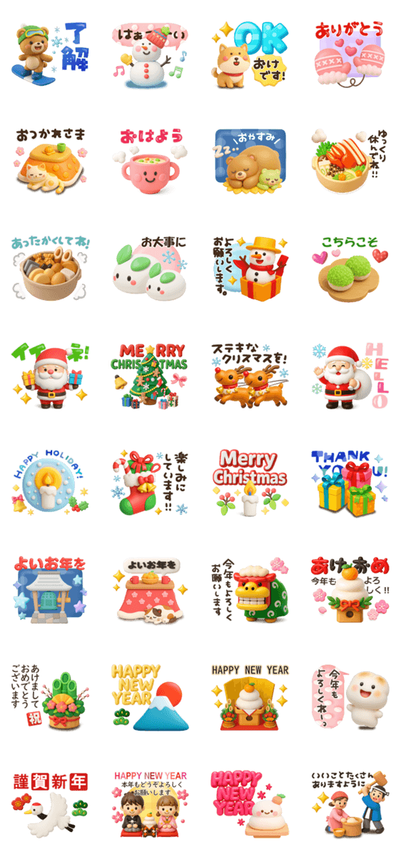 お正月クリスマス冬に使える3Dスタンプです!あけおめ/今年もよろしくお願いします/ことよろ/よいお年を/メリークリスマス/謹賀新年/鍋