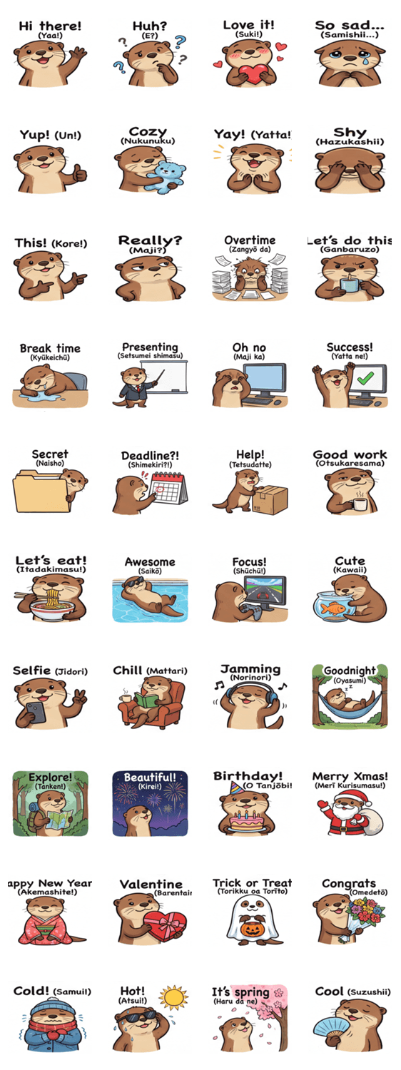手描きのカラフルなカワウソスタンプ!日常会話や仕事で使えるリアクションがいっぱい。癒しの瞬間や共感できる職場ネタも満載です。