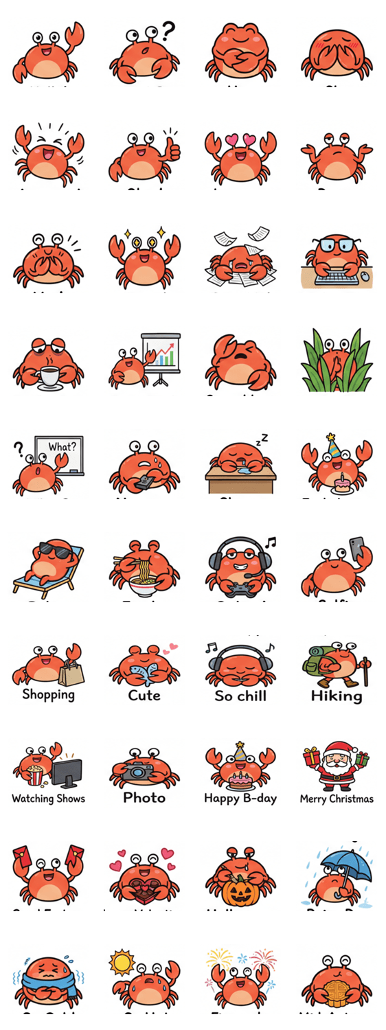 手描きのカニがチャットを彩ります!仕事のストレスや日々の気分をユーモラスに表現するのに最適です。