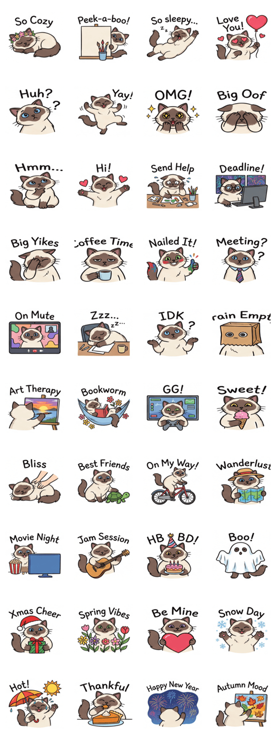 現代生活にぴったりな芸術的なバーマン猫のスタンプ!日常会話や共感できる職場のネタを含む、カラフルな手書きデザイン40種類入り。