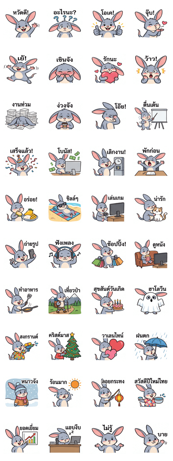 キュートで心配性なビルビーの手描きスタンプ。仕事や日常会話で使えるタイ語フレーズ付き。大きな耳と豊かな表情で毎日を楽しく!