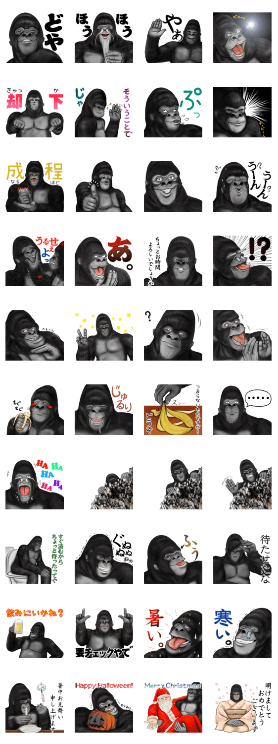 リアルなゴリラのスタンプです。挨拶,煽り系,相槌,春夏秋冬のイベント関連(暑中お見舞い,ハロウィン,クリスマス,正月の年賀状)など色々入れてます。