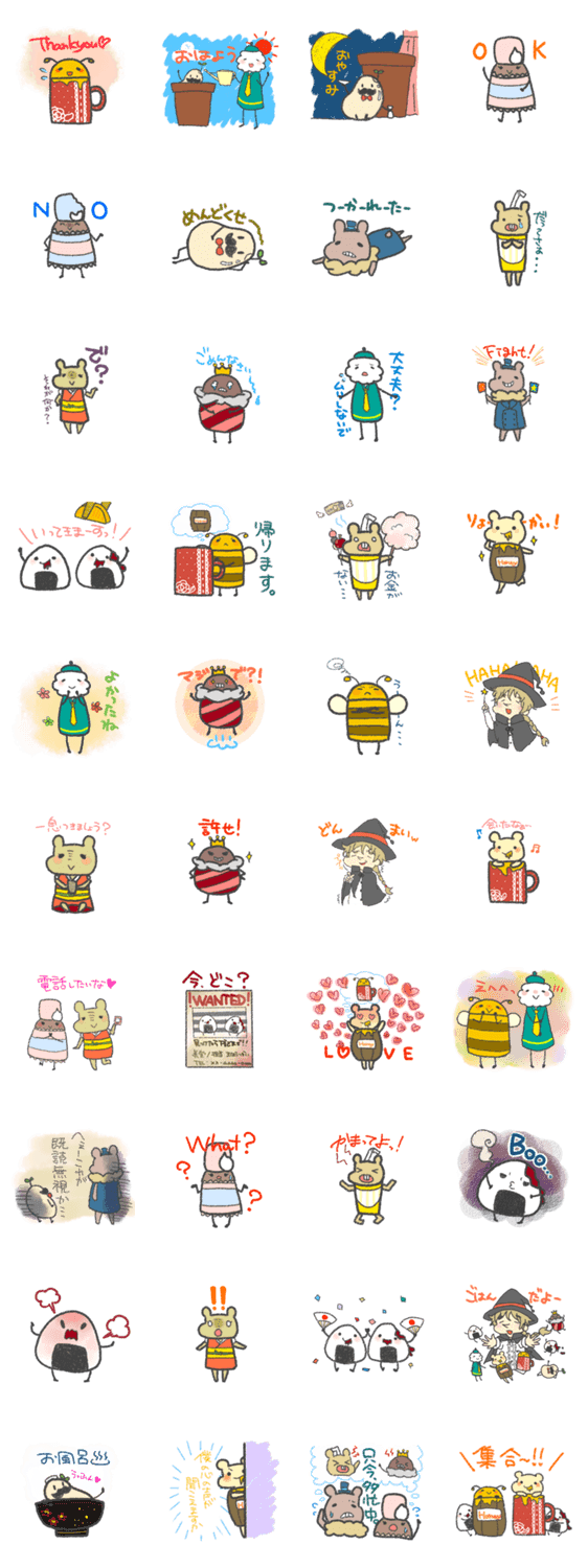 魔法使いさんの手によって生まれた、ハニミルさんと愉快で可愛い仲間たちをスタンプにしました。